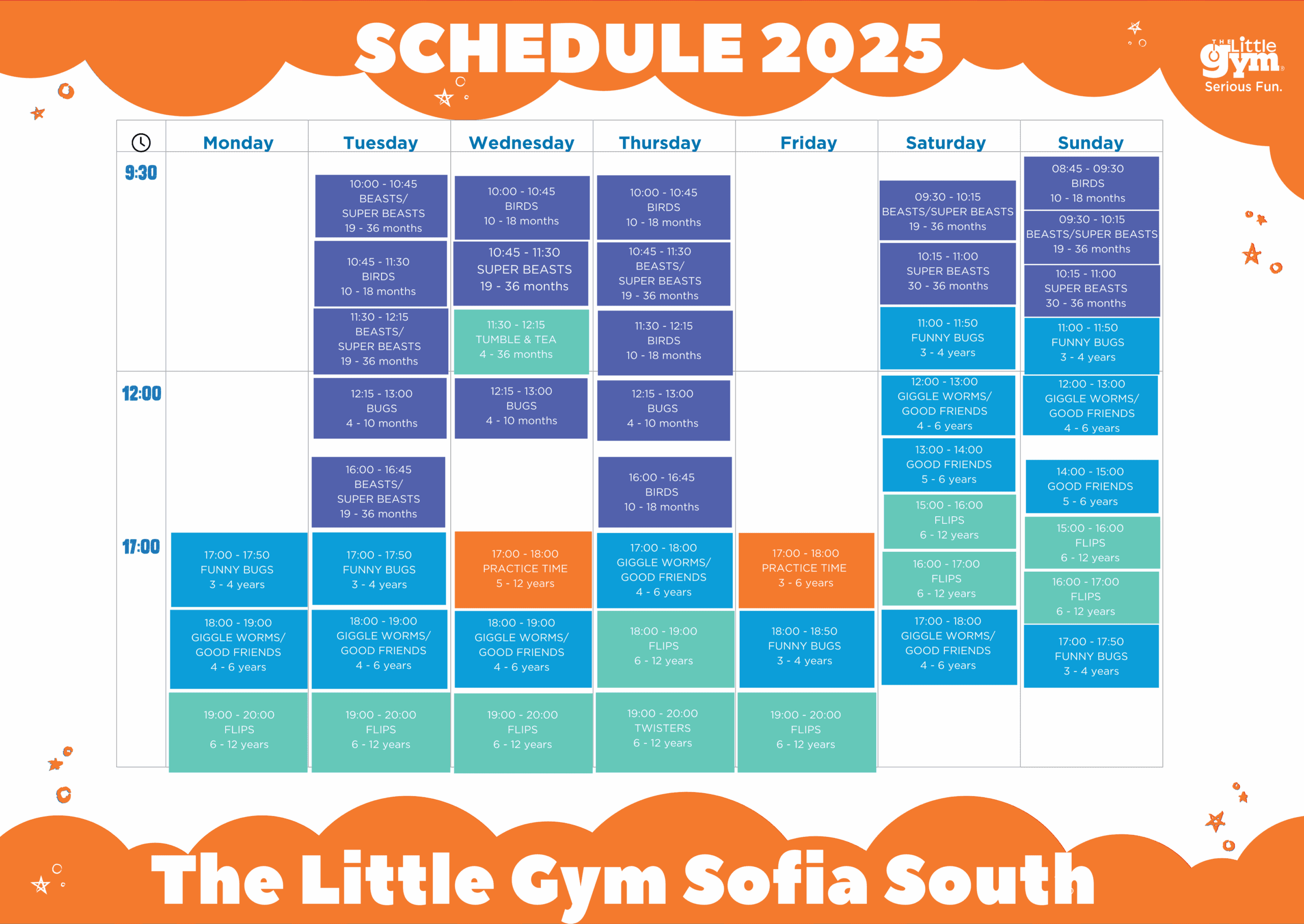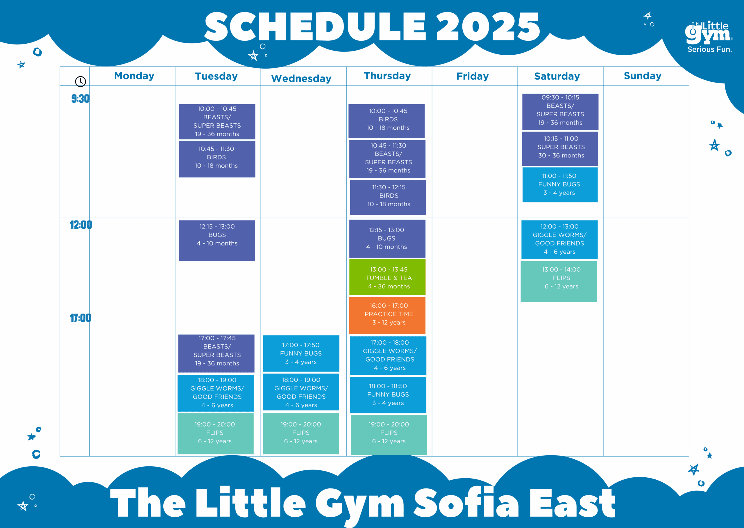 - Additional activities: Practice Time and Tumble & Tea workshops